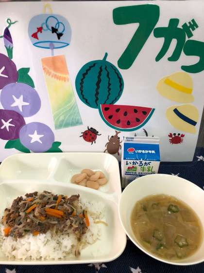 「牛丼」は、児童に人気の献立で、牛肉、糸こんにゃく、玉ねぎ、にんじん、青ねぎ、えのきたけを甘辛く味つけし、煮こんでいます。