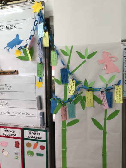 笹の葉に短冊に書いた願い事を飾ると、織姫と彦星の力で願いが叶えられたり、みんなを悪いものから守ってくれるという言い伝えがあるそうです。「願い事」叶いますように。。。