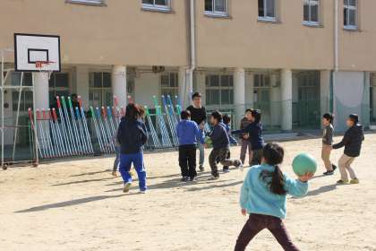 4・5・6年生は、ボール運動が人気です。先生も一緒になって、バスケットボールをしていることもあります。