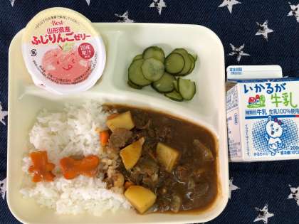 今日のカレーライスは、小麦粉の代わりに米粉をつかったカレールウの素で味つけし、とろみをつけました。
