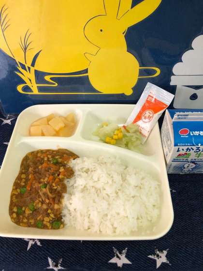 「キーマカレーライス」とは、ひき肉を使ったカレーのことです。今日は、ひき肉のほかに、ひきわり大豆もつかっています。