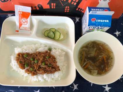 牛ひき肉、豚ひき肉、たまねぎ、グリンピースを炒め、味つけし、ごはんにかけて食べます。