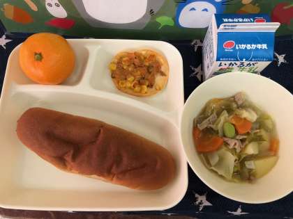 給食の変わりピザは、ギョーザの皮に、ツナ、コーン、ピーマン、ピザソース、チーズを混ぜ合わせた具をのせ、焼き物機で焼いています。