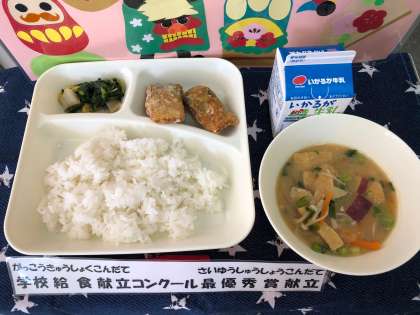 献立のねらいは、冬が旬の食材を選びました。さばは、みんなが大好きなカレー味にし、みそ汁が甘くなるよう、さつまいもを入れました。煮びたしは、彩りを考えてはくさいを加えました。