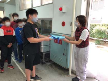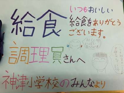 今週は、給食週間です。火曜日の放送集会では、給食のことを知ってもらうために給食委員会が発表を行いました。また、いつもおいしい給食を作ってくださっている給食調理員さんへの感謝の気持ちを伝えるために、メッセージも渡しました。これからも、おいしい給食をたくさん食べて元気に過ごしていきたいと思います。