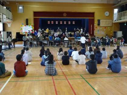 5年生が花のアーチを持ち、花道を通って6年生は退場しました。