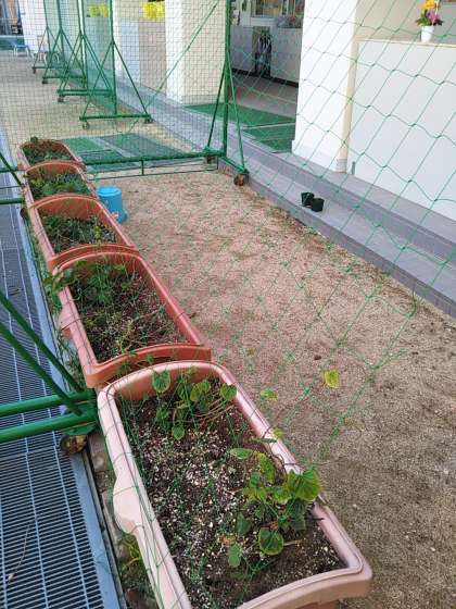 管理作業員さんが壁面緑化のため職員室前の廊下の壁にリュウキュウアサガオを植えてくださいました。ありがとうございます。