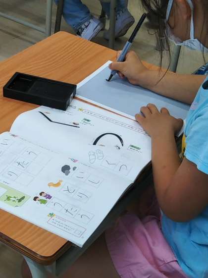 写真は書写の授業で、先生の手本をしっかりと見てから水筆を使って練習をしています。みんな頑張っていますね。