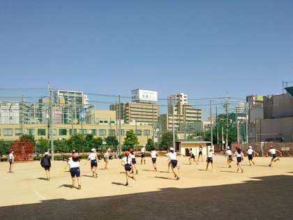 暑さに負けず、6年生の子どもたちが体育の授業でリレーの練習をしています。元気にがんばっています!