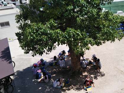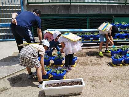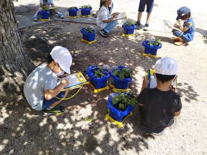 1年生がアサガオの観察をしています。どんどん成長して大きくなっています。これからもしっかりお水をあげてくださいね。