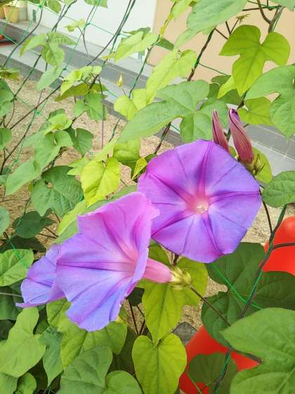 管理作業員さんにグリーンカーテンとして植えていただいたリュウキュウアサガオの花が咲きました。もうすっかり夏ですね。
