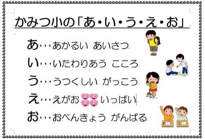 神津小の”合言葉”は、「かみつ小のあ・い・う・え・お」です。合言葉を忘れず、素敵な神津小学校にしましょう。とても楽しみです。