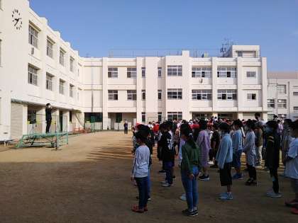 今日は全校朝会の日です。土曜日の運動会での頑張りと読書週間についてお話ししました。