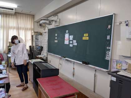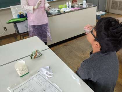 4年生を対象にした「フッ化物洗口」を実施しました。10分ほど各教室でフッ化物や、歯のはたらきなどについて学習しました。その後、学校歯科医の渚先生と教育委員会より来られた歯科衛生士の方が、感染予防対策も行いながら、家庭科室で9人ずつフッ化物洗口を行いました。