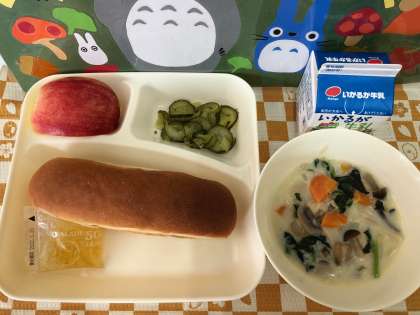 今日の給食の「きのこのクリームシチュー」には、しめじ、エリンギ、マッシュルームを使っています。