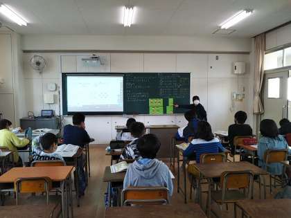 5年生の少人数授業の様子です。単位数あたりの大きさを求める内容でしたが、求め方の見通しを立て、意見を出し合い、答えを導き出していました。少し難しい内容でしたが、みんな頑張っていました。