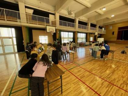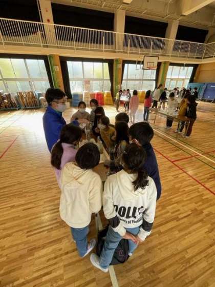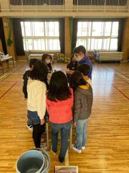 濾過実験の様子です。果たして、汚れた水はきれいになるのでしょうか。子どもたちは説明をしっかり聞き、グループで協力しながら夢中になって実験に取り組んでいます。