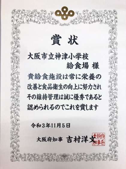 大阪府の食品衛生関係優良施設知事表彰を受賞しました。