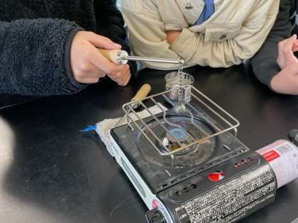 温度による金属の体積の変化を実験で確かめました。熱する前は金属の玉が輪を通り抜けたのに、熱すると輪を通り抜けなくなりました。
