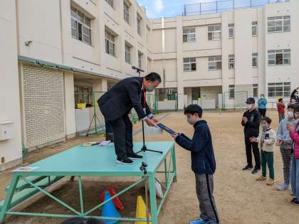 全校朝会で、色々な分野で結果を残した児童の表彰を行いました。