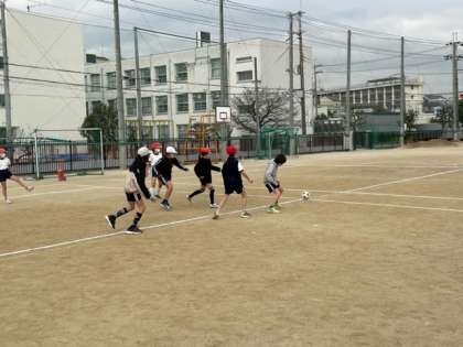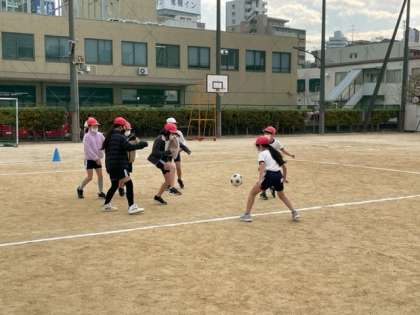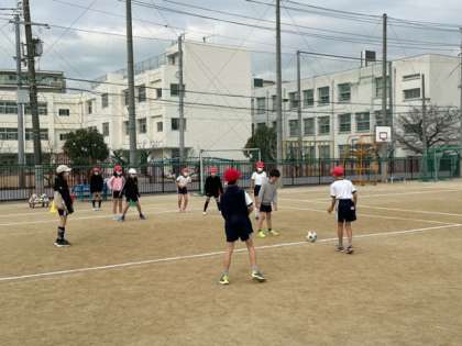 体育の時間に、簡単なルールでミニサッカーをしました。子どもたちは、「パスちょうだい!」「○○さん、シュート!」など、お互いに声をかけあいながら、楽しくサッカーをしました。