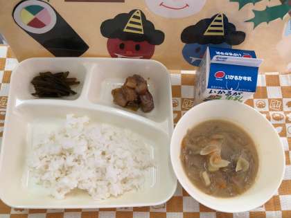 今日の給食では、くきわかめをだしで煮、砂糖、みりん、こいくちしょうゆで味付けしたつくだ煮にしています。ご飯に合う一品です。