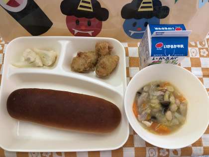 給食の白身魚のフリッターは、白身魚の「たら」を使っています。また、衣に卵は使っていません。