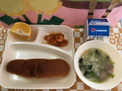 給食の中華がゆは、米のほかに肉だんご、だいこん、チンゲンサイ、にんじんが入っています。