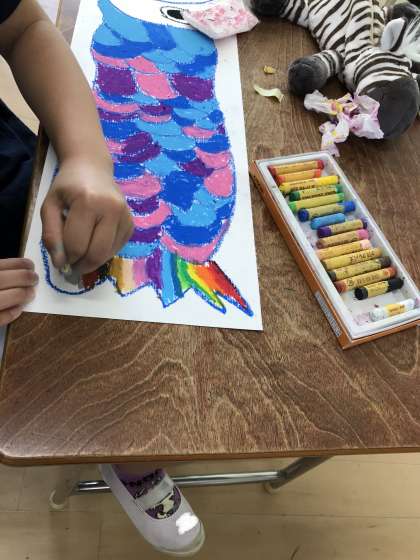 図工の時間にこいのぼりの絵を描きました。一枚一枚、うろこにしっかりと色を塗りこみました。できあがりが楽しみです。