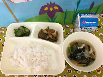 今日の給食では、豚バラ肉をゆでてから、他の材料と一緒にいためています。