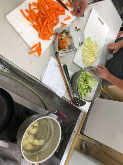 野菜を切り、油をひいたフライパンでいためていきます。にんじんは固いのでじっくりいため、ピーマン、キャベツの順に入れ塩、こしょうで味つけをしました。じゃがいもは皮をむき水からゆでました。