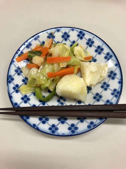 献立は、にんじん、キャベツ、ピーマンを使った「三色野菜いため」と「ゆでじゃがいも」です。