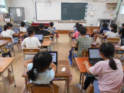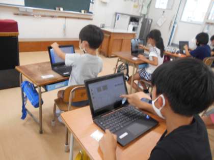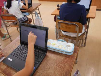 今日は雨のため、プールに入れませんでした。水泳学習が大好きな2年生はがっかり。かわりにタブレットをしました。心の天気を入れ、デジタルドリルで今までの学習の復習をしました。タブレットの操作にも随分慣れ、得意な人は友だちにも教えてくれています。