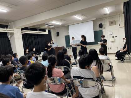 プロジェクターを使用してBGMなども工夫していただき、とても見やすく聞きやすかったです。子どもたちは真剣に聞いていました。平和が当たり前なことじゃないと改めて考えることができました。