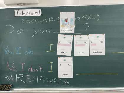 今回の外国語では、ホームや家でどれくらいお手伝いをするか聞き合いをしました。ダニエル先生は家でとても家事を分担していて、みんながとても驚いていました!すごいですね。