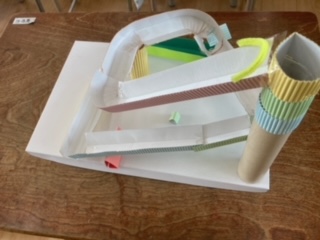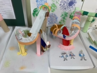 四年生の図工では「コロコロガーレ」をしています。すべり台を設計したり、ジャンプ台を設置したりしています。上からビー玉を落として下までコロコロ転がるように一生懸命作っています。出来上がりが楽しみです。