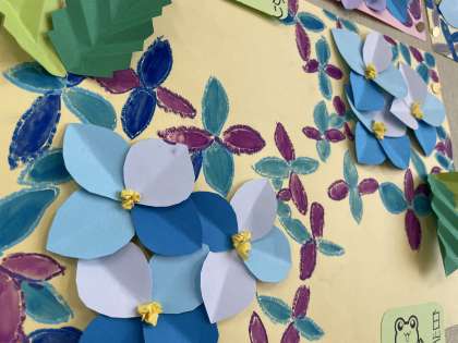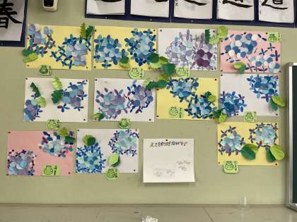 やっと遅咲きのアジサイが咲きました。画用紙、パス、絵の具を使ってアジサイを表現しました。1人1人が素晴らしい出来です!教室がパッと明るくなってとても嬉しいです。2学期の図工も楽しみですね。教室の掲示は綺麗だと教室の雰囲気も変わります!次の作品はなんだろう!!!