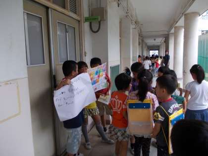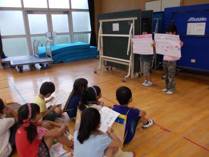 講堂に集まって互いに挨拶をした後、各グループに分かれて学校たんけんに出発!2年生は1年生と一緒に校内を回る係と、各教室の紹介をする係に分かれました。練習の成果が出て、迷子になる班はほとんどありませんでしたし、大きな声で上手に紹介することができていました。
