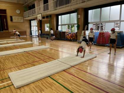 1学期より発展した技の練習に取り組んでいます。側転やロンダートなど難しい技を一生懸命練習しました!さぁ次もがんばりましょう!
