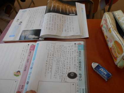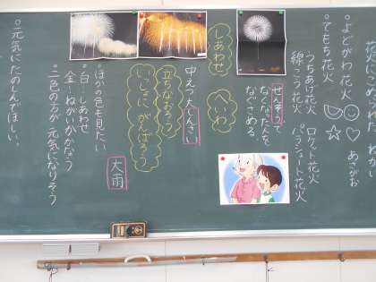 今日は『花火にこめられたねがい』の学習をしました。少し難しい内容かと思いましたが、豪雨での被害やロシアとウクライナとの戦争を知っている人が多く、「ずっとへいわがつづいてほしい。」「かなしいひとたちに、ひとりでもたくさんえがおで元気づけたい」「しあわせとねがいがかなう花火になってほしい」など、次々と挙手して発表していました。華やかな花火の裏にこめられた願いについて、しっかりと考えることができました。