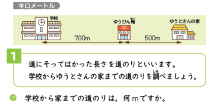 道に沿って歩いた長さを「道のり」ということ、学校から郵便局までと郵便局からゆうとさんの家までのそれぞれの長さを足すと学校から駅までの道のりが出ることに気付き、式を立てることができました。