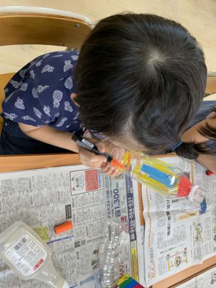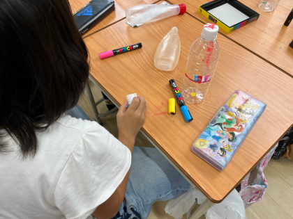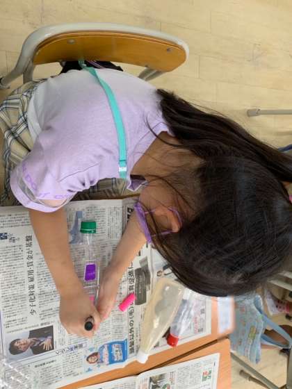 9月8日(木)に行う予定の生活科「みずであそぼう」の学習にむけて、ペットボトルにマーカーで絵を描きました。子どもたちは、的に水をかけたり、友だち同士で水をかけ合ったりするのを楽しみにしています。