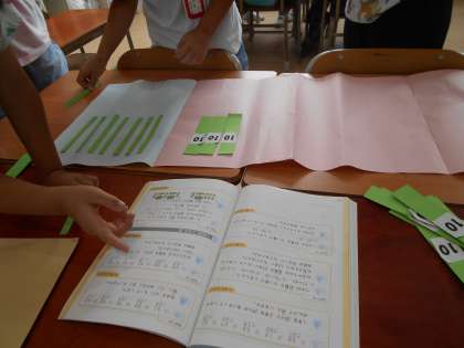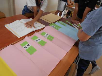 「たし算とひき算のひっ算(2)」の学習をしています。百の位に繰り上がったり繰り上がりや繰り下がりが2回ある筆算はとても難しいので、位ごとに色分けした位取り表の上で計算棒を自分たちで操作して、計算の方法を身に付けるようにしています。難しい学習ですが、正しく計算できるようになるために、最後まであきらめずに取り組んでほしいです。