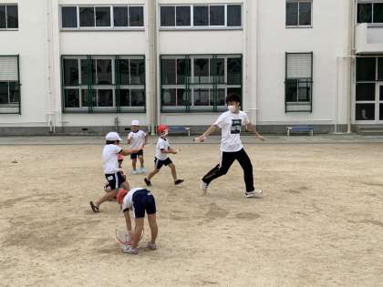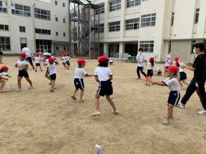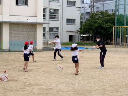 後半は、友だちどうしで水をかけ合っています。秋月先生や教育実習生の野村先生、福川先生も参加し、みんなキラキラ笑顔で楽しみました。