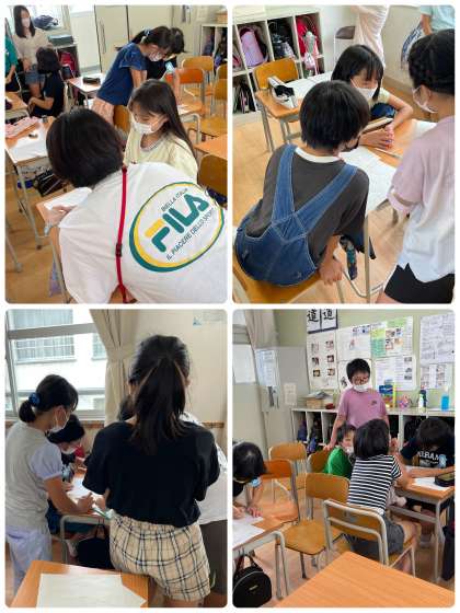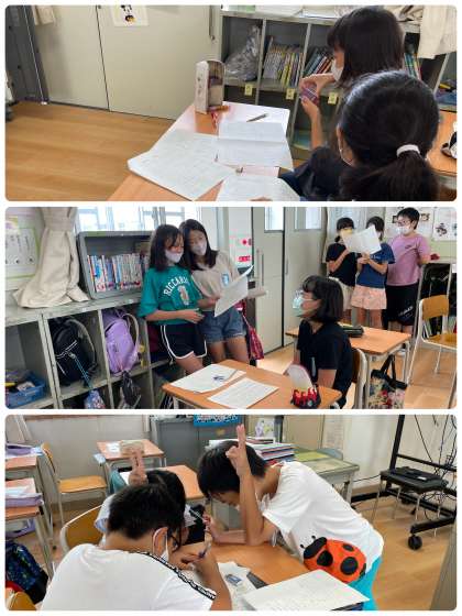 総合の時間には、林間学習に向けて活動班の係ごとに集まって準備を進めています。班長、副班長は、代表の言葉や司会の言葉を考えて、練習をしました。美化・保健係は、しおり作りやバスで流す曲を集計などを行いました。