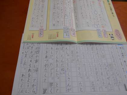今日の書写は、原稿用紙の使い方を学びました。特に難しいのは、かぎかっこの使い方です。原稿用紙に文章を書く機会が少ないので、「かぎかっこの横は1ます空ける。」「かぎかっこを1ますの中のどこに書くか。」はつい忘れてしまう人が多く、夏休みの課題でも間違える人が多かったです。今日は教科書の手本を見ながら、ゆっくりていねいに視写をしました。分量が多かったですが、みんな集中して書いていました。1時間の学習が終わると、鉛筆を持っていた手が黒くなっている人が続出しました。がんばって、ていねいに書いた証です。
