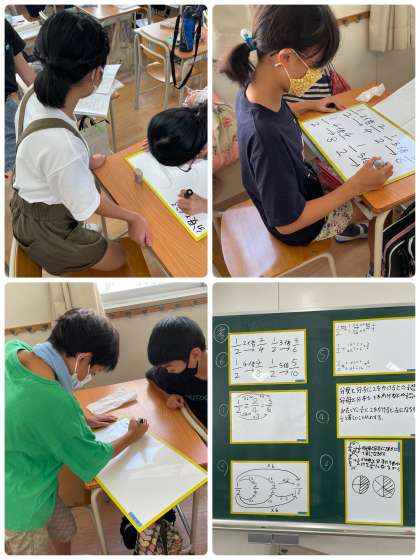 今日から分数の学習に入りました。1/2から2/4、3/6、6/12にするためにはどうしたらよいのかを考えました。まず、1人で考えノートに書き、グループで交流しました。そして、グループでよりわかりやすい考え方をホワイトボードに書き、発表しました。初めての取り組みでしたが、グループで協力して素晴らしい発表になりました。みんながいきいきと活動していて、楽しい45分間でした。