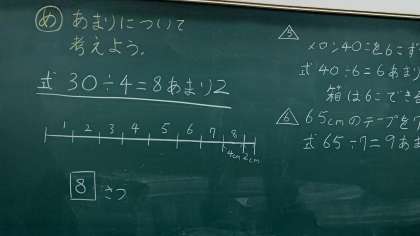「幅が30cmの本棚に厚さ4cmの本を入れていきます。何冊入れることができますか?」の問題に「あまりが2cmあるけど本が入れれない!」事に気付くことができました。「そんな時は余りを含まない!」と考えることができました!