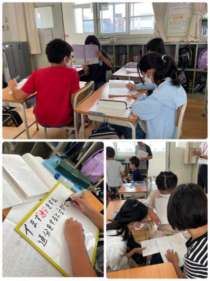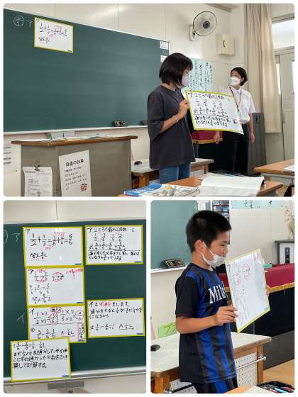 分数のたし算、ひき算の学習です。通分しないと計算できないことをすぐに気付き、自分なりに言葉を選んだり、書き方を工夫したりして、考え方を書いていました。その後いつも通りにグループ交流をして、ホワイトボードによりわかりやすい説明を書いてから、全体で発表しました!子どもたちの意見がそのまま黒板に貼られて、それが授業の中心になりました。グループの協力も素晴らしいです!明日も頑張りましょう!