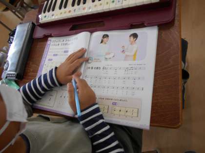 今日は四分音符と四分休符を学びました。四分休符をかくのは難しく、なかなか納得のいく形にならなくて苦戦しました。四分音符はまるい部分を塗るかどうか迷う人たちがいましたが、「それ塗らんかったら別の音符になるで。」とすかさず教えてくれている人もいました。その後、曲に合わせて休符の部分を手や足で打つ練習をしました。今日も楽しく歌ったり演奏したりすることができました。